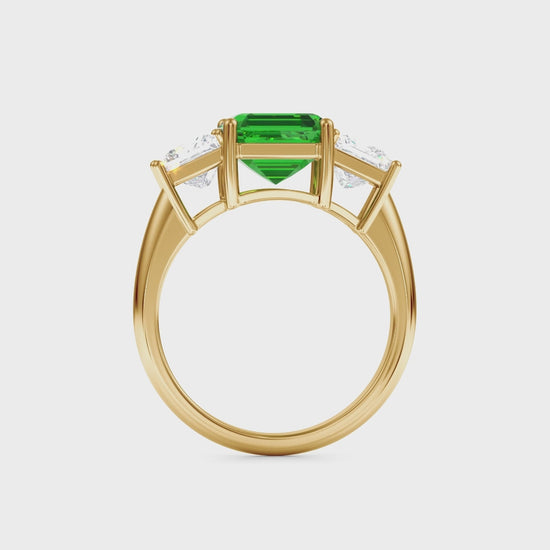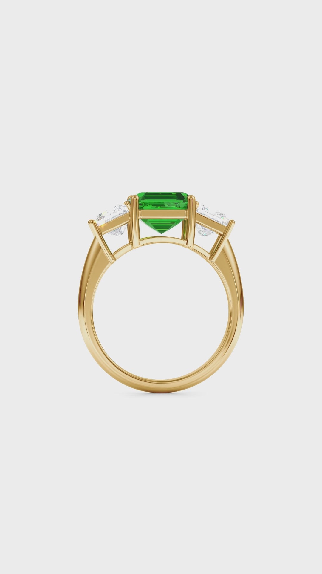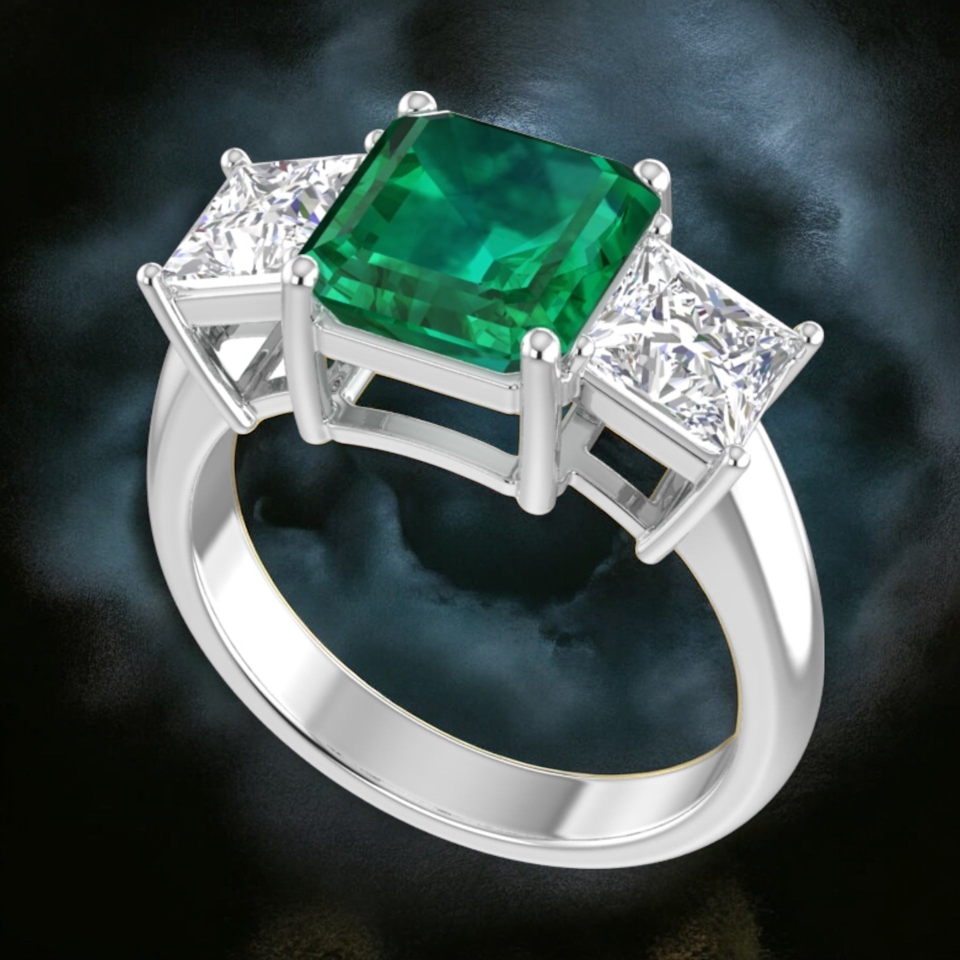 Laboratory grown, asscher cut emerald with an estimated weight of 1.98 - 2.50ct set with two laboratory grown princess cut diamonds, estimated weight 1.50 - 1.70ct each. Diamonds will be DEF VVS - VS with a GIA report. Stones to be set in recycled 18k gold.
