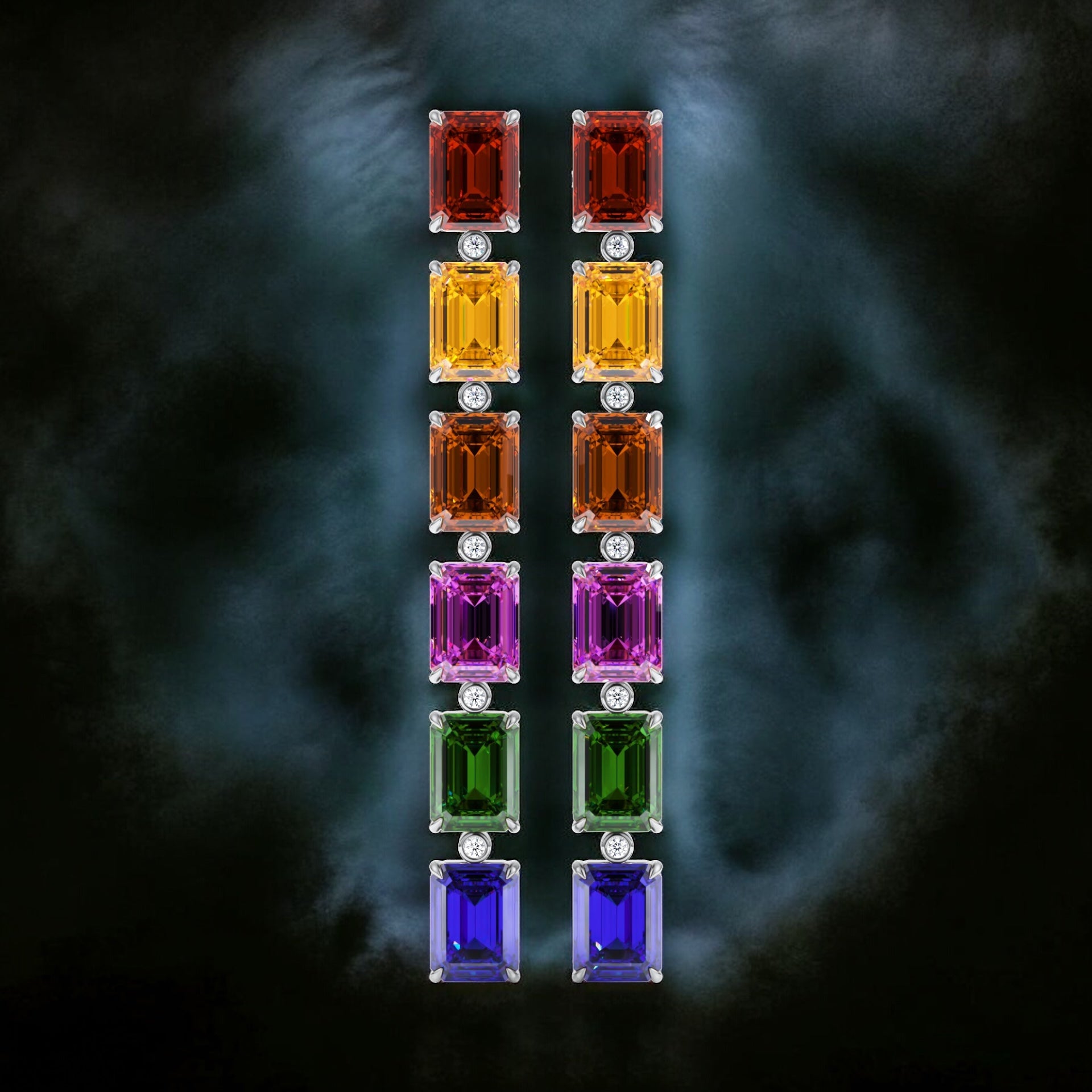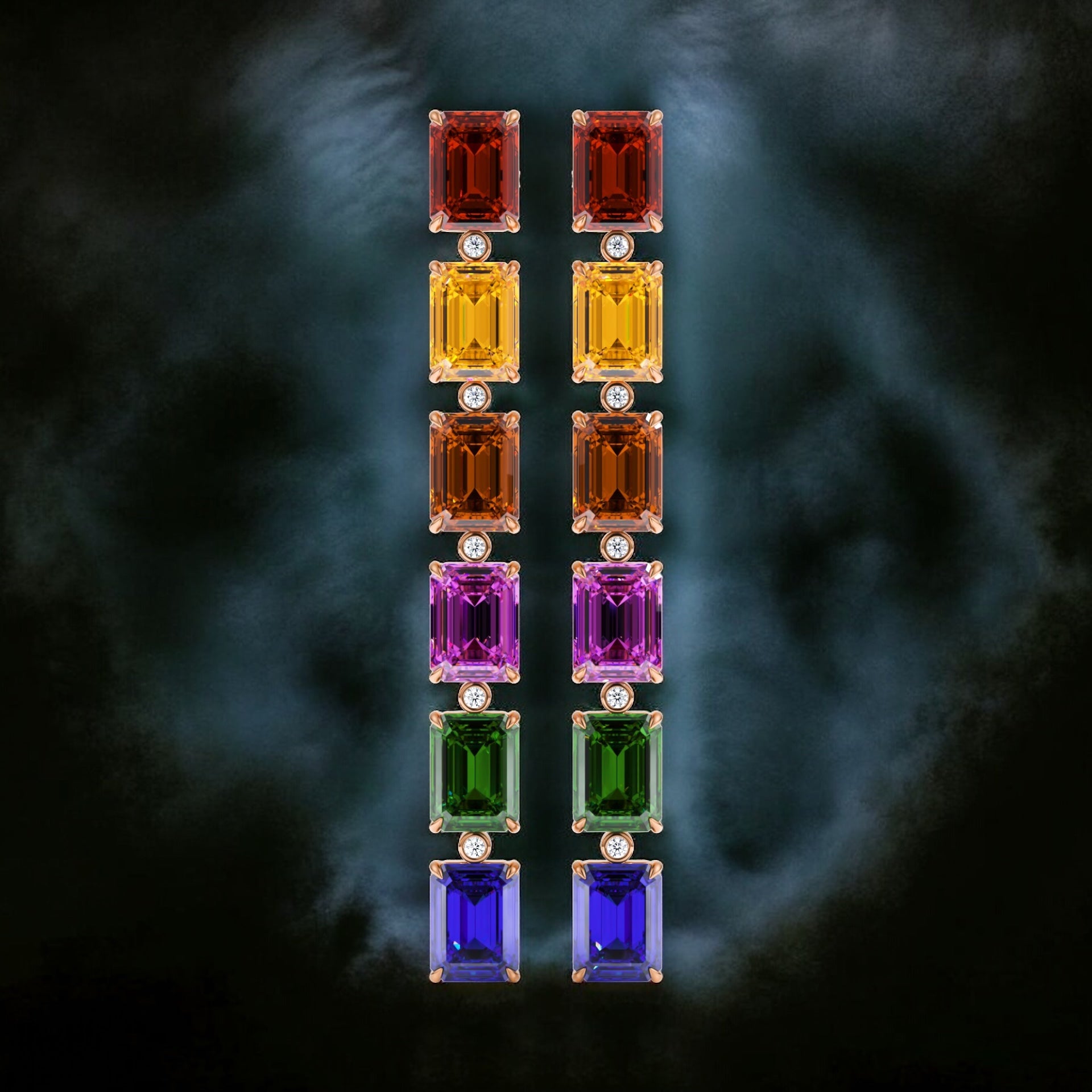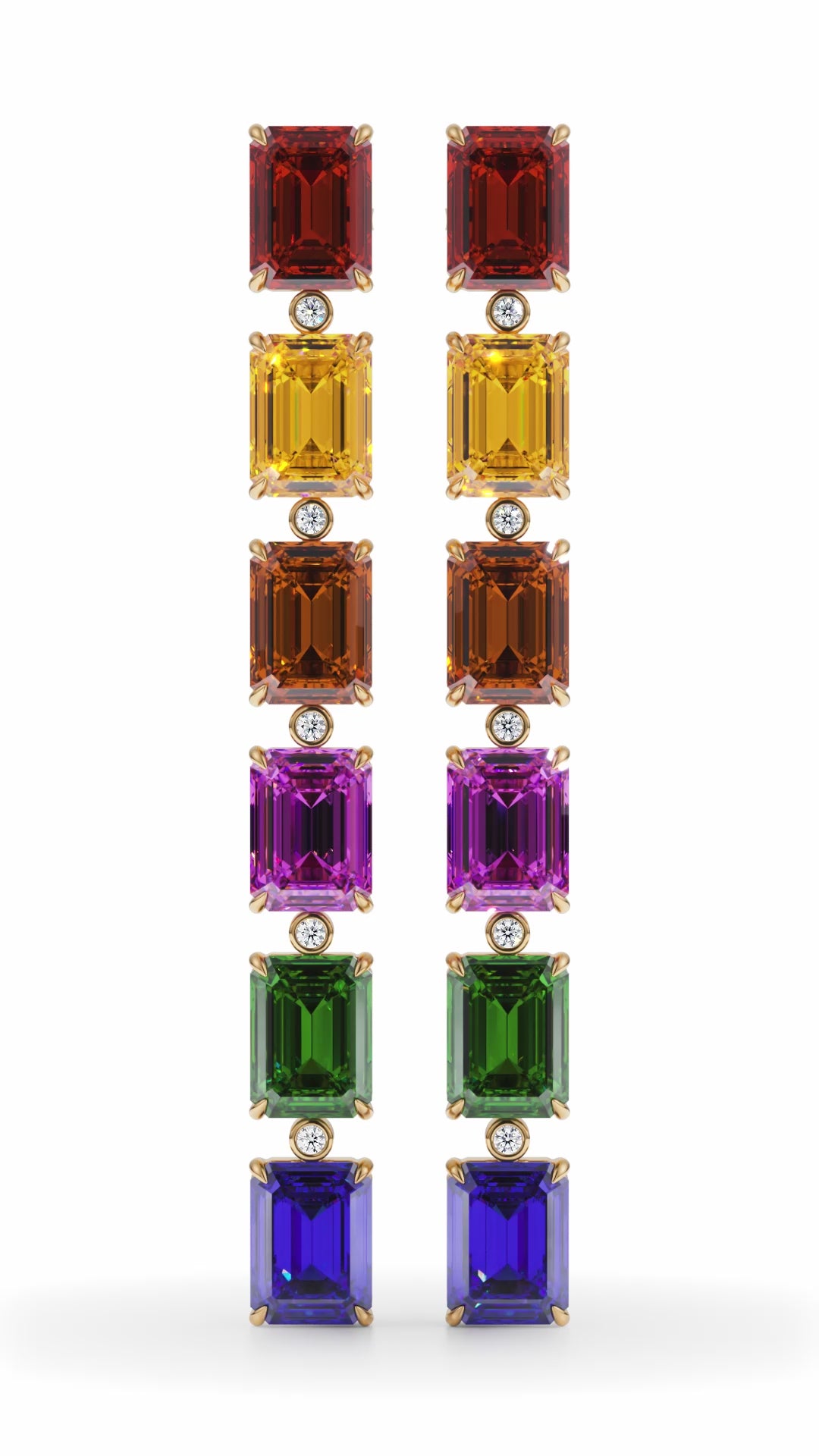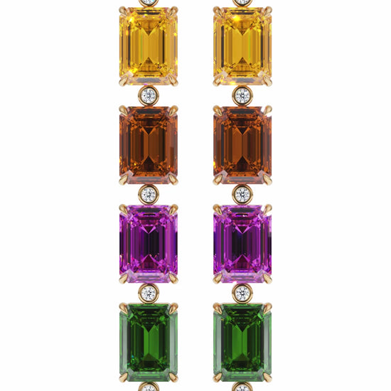Laboratory grown, emerald cut ruby, yellow, orange and pink sapphire, green tsavorite and blue sapphire with an estimated total weight of 10.20ct. Set with laboratory grown round cut diamonds, with an estimated total weight of 0.17ct. Diamonds will be DEF VVS - VS. Stones to be set in recycled 18k gold.