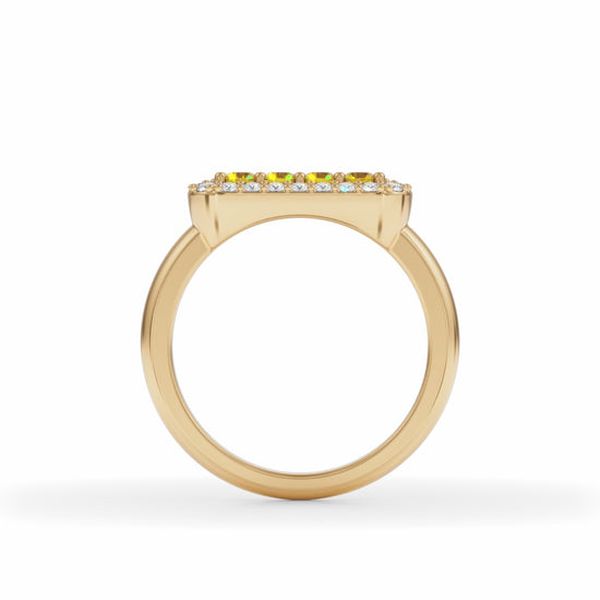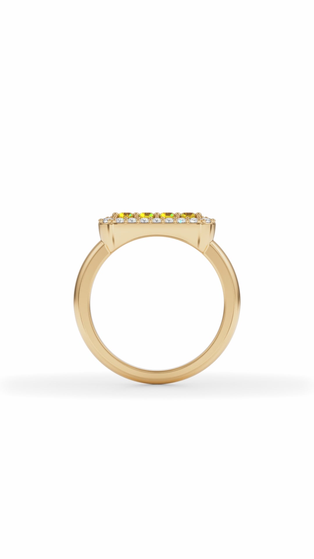 Laboratory grown, round cut yellow meleé diamonds surrounded by laboratory grown white meleé diamonds with an estimated weight of 0.52ct. Diamonds will be VVS - VS in clarity. Stones to be set in recycled 18k gold.