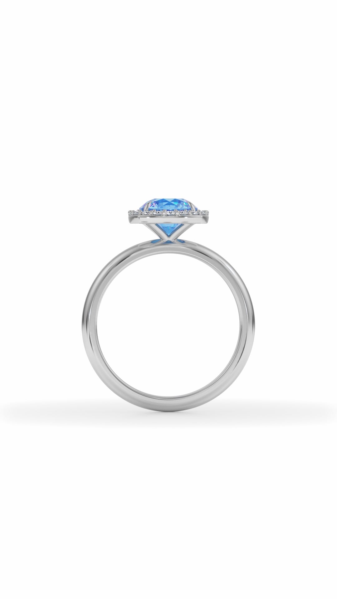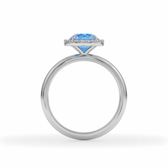 Laboratory grown, round cut aquamarine with an estimated weight of 1.60ct set with meleé laboratory grown round cut diamonds, estimated weight 0.21ct. Diamonds will be DEF VVS - VS. Stones to be set in recycled 18k gold.